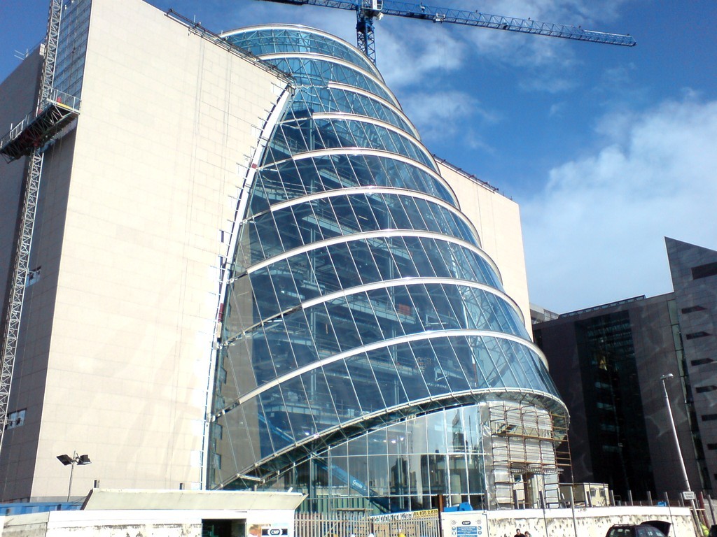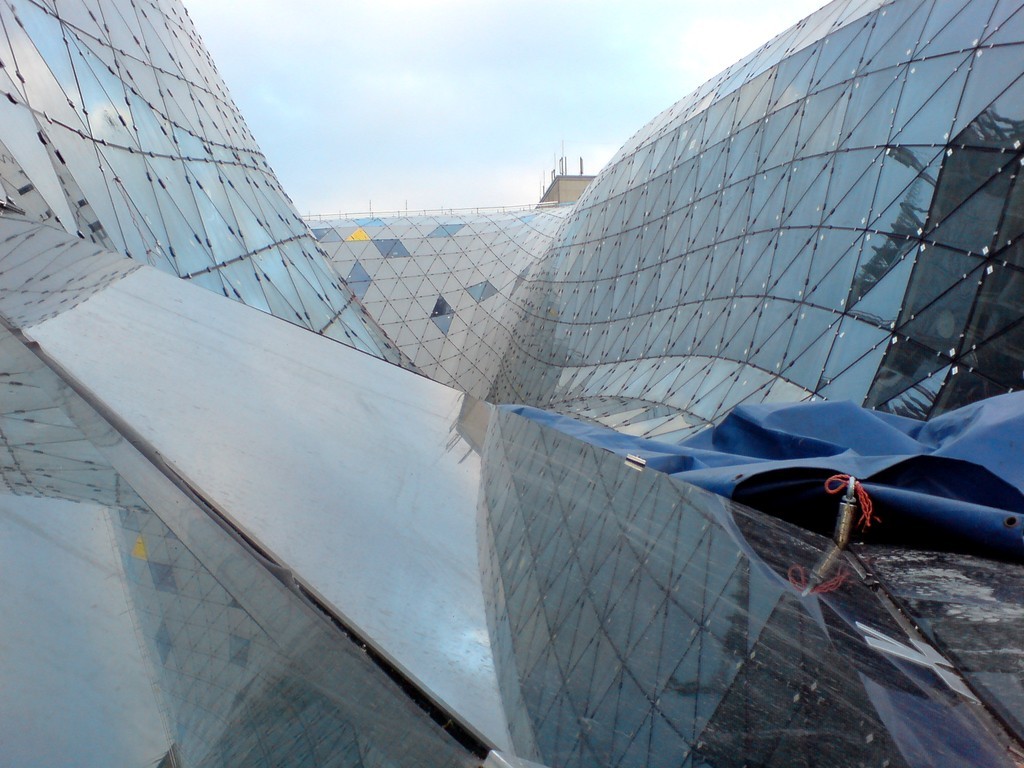 Montage von Glas und Aluminium-Paneels in sich stets verändernden Neigungen und Lagen; Versiegelung der Gebäudehülle