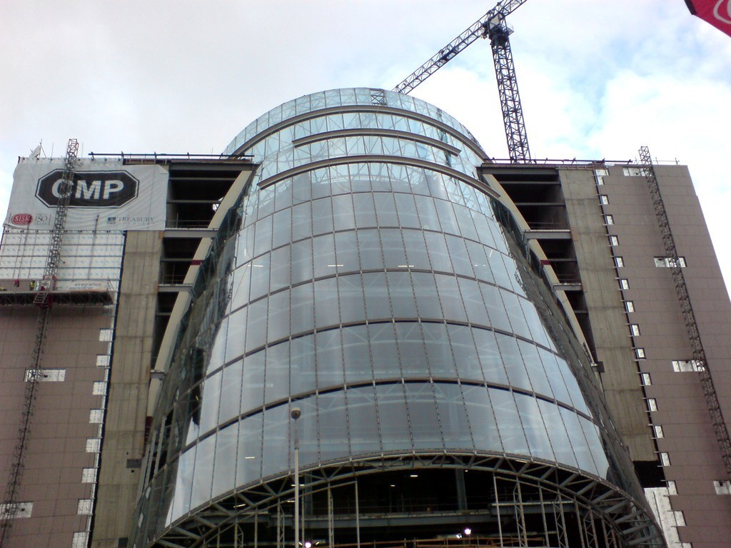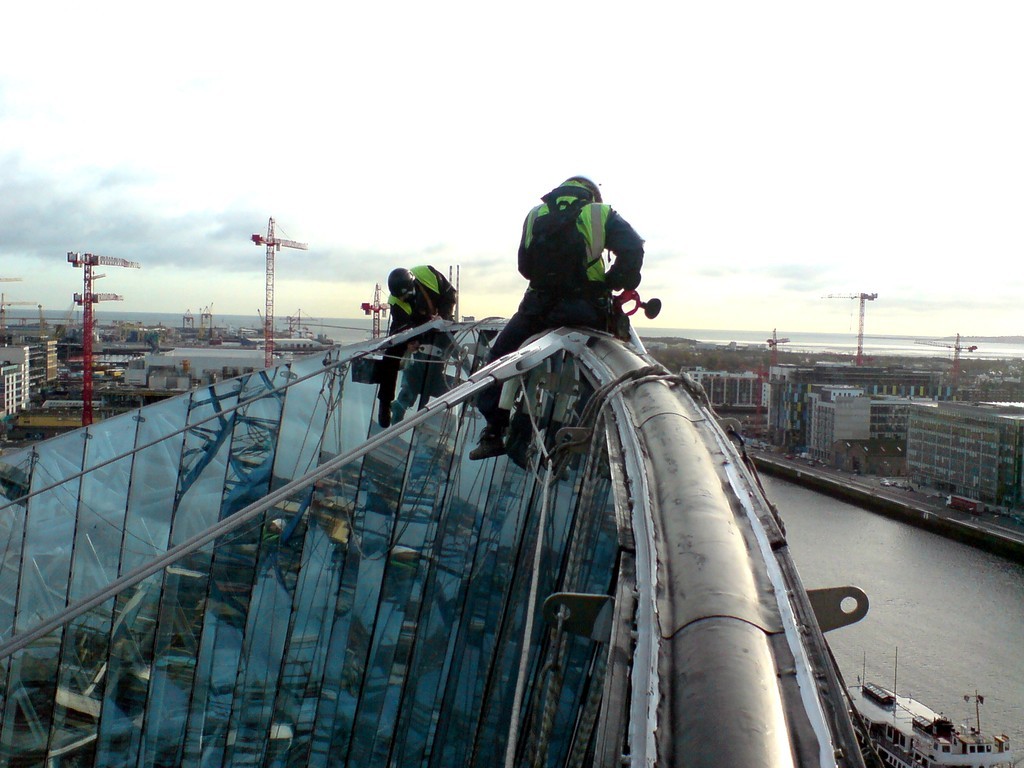 Montageunterstützung beim Sekundärstahl sowie beim Aufziehen eines diagonal verspannten Stahlseilgeflechtes, in das die Verglasung anschliessend eingehängt wird. Diese Art der Fassadeninstallation ist europaweit einmalig.