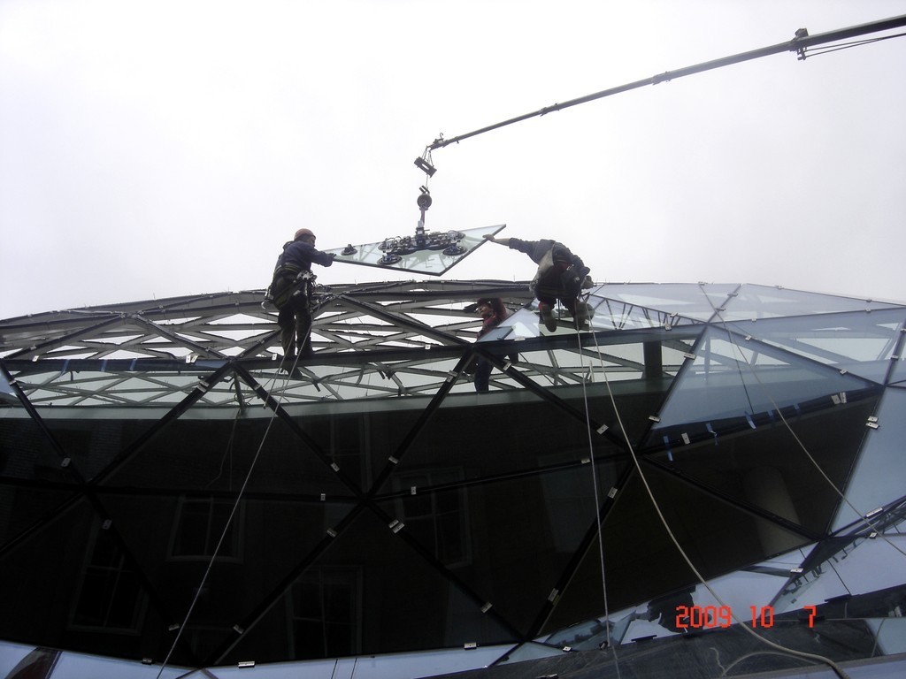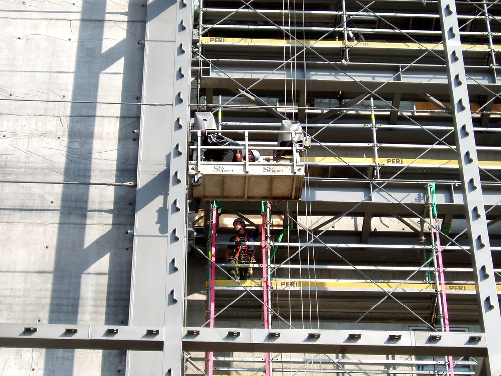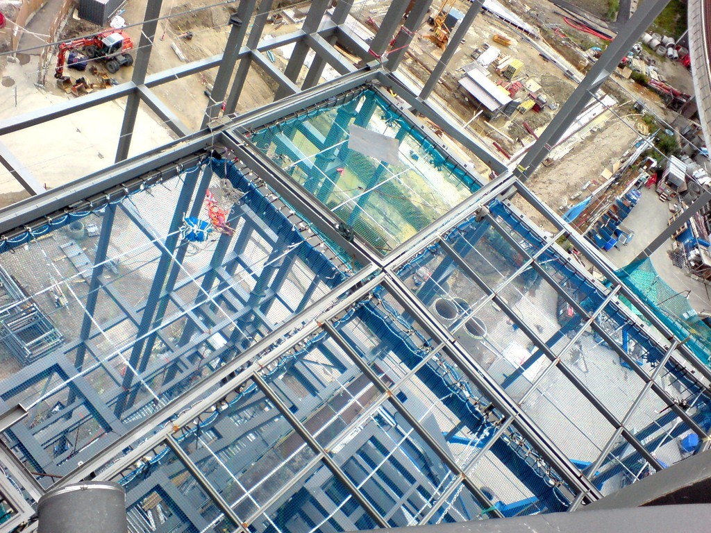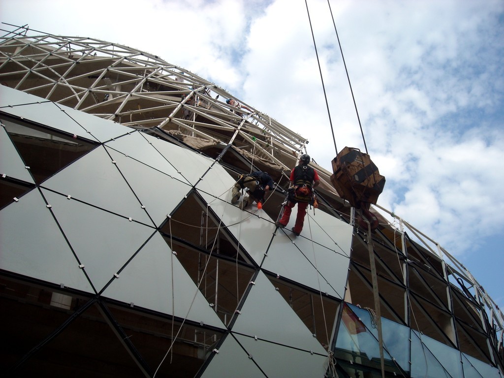 Montageunterstützung beim Sekundärstahl sowie beim Aufziehen eines diagonal verspannten Stahlseilgeflechtes, in das die Verglasung anschliessend eingehängt wird. Diese Art der Fassadeninstallation ist europaweit einmalig.