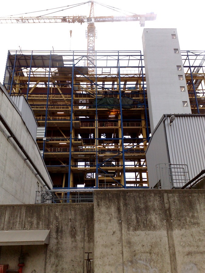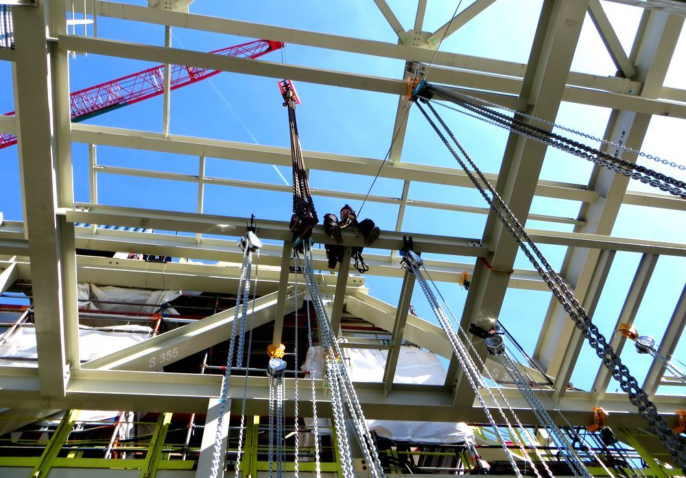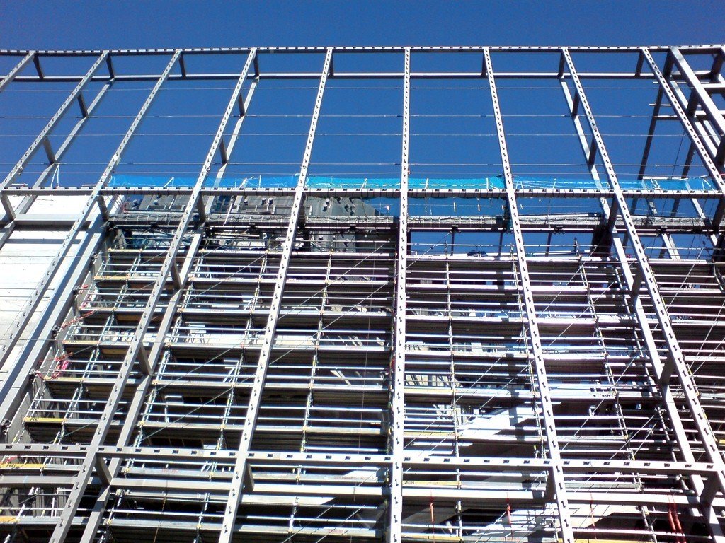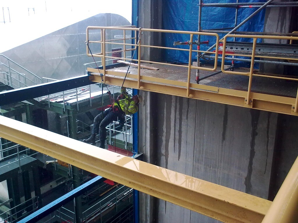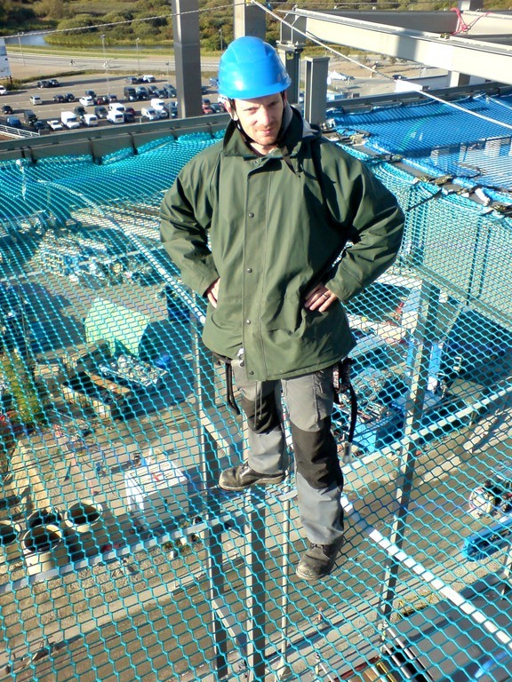 Montageunterstützung beim Sekundärstahl sowie beim Aufziehen eines diagonal verspannten Stahlseilgeflechtes, in das die Verglasung anschliessend eingehängt wird. Diese Art der Fassadeninstallation ist europaweit einmalig.